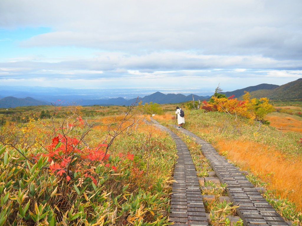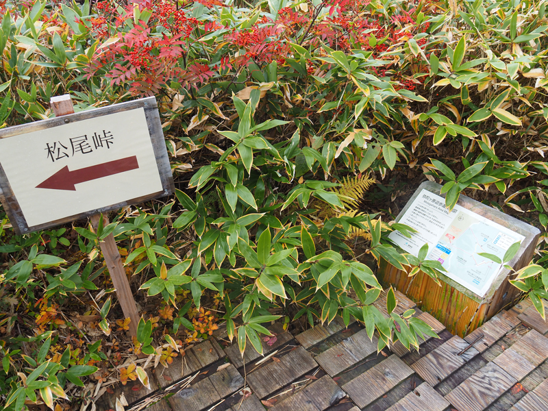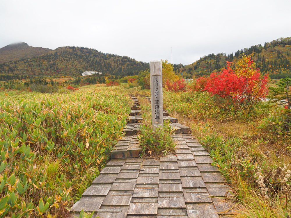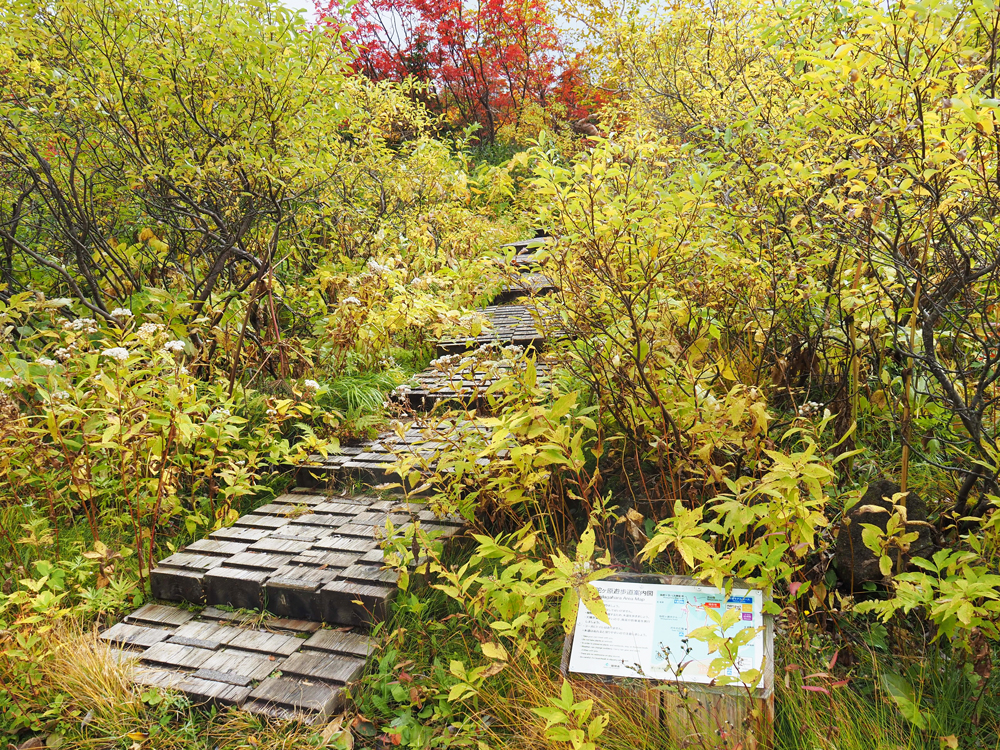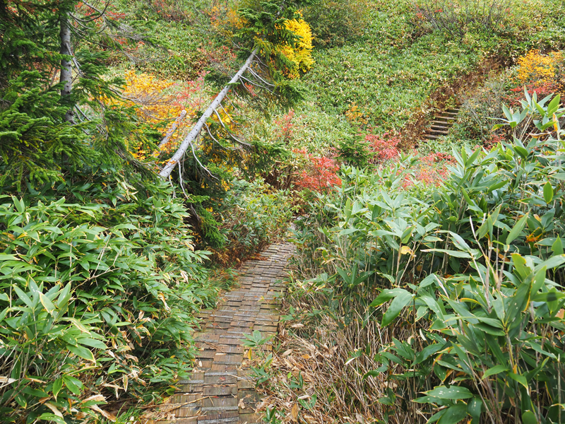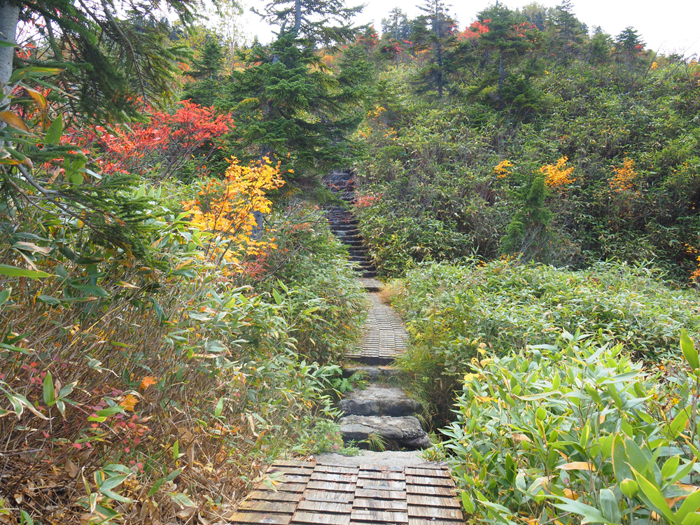 ここからは少し緩やかな上り坂。紅葉に木々に囲まれた木道を歩いていきます。