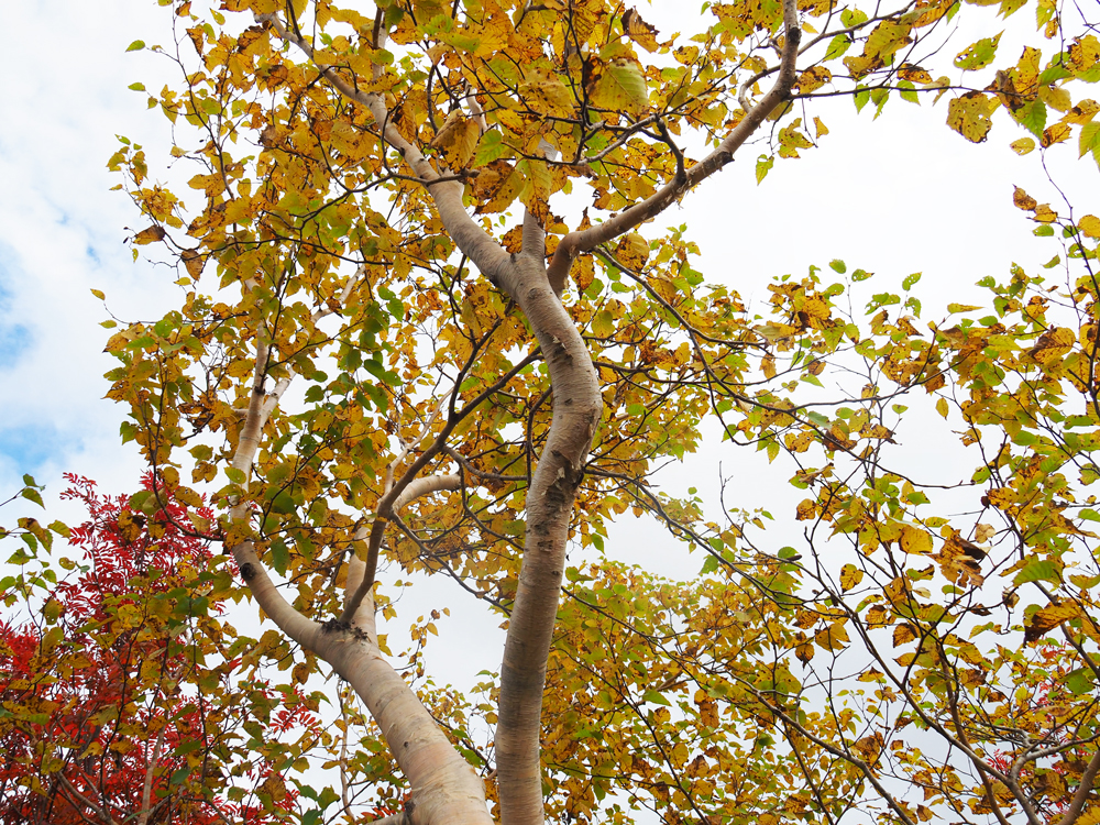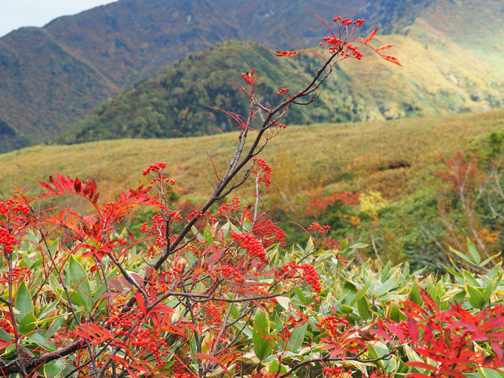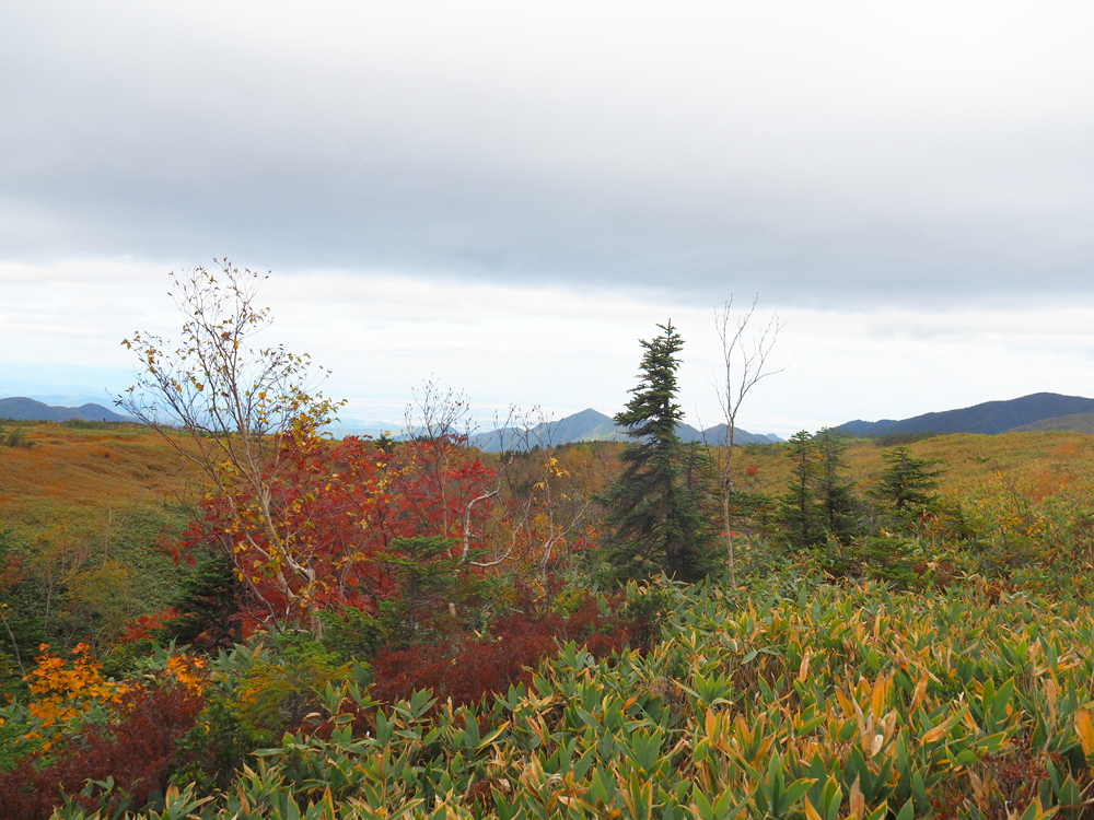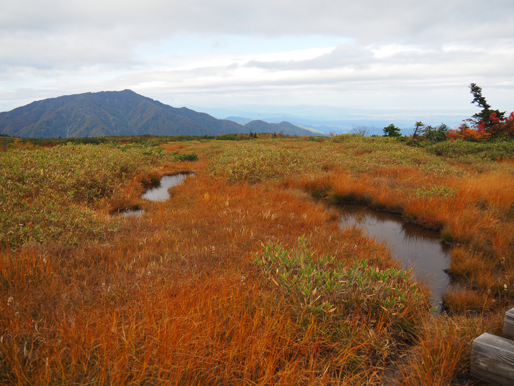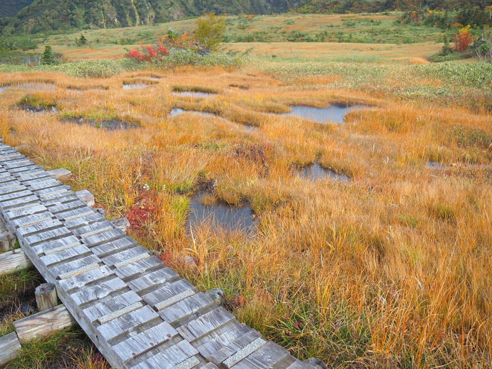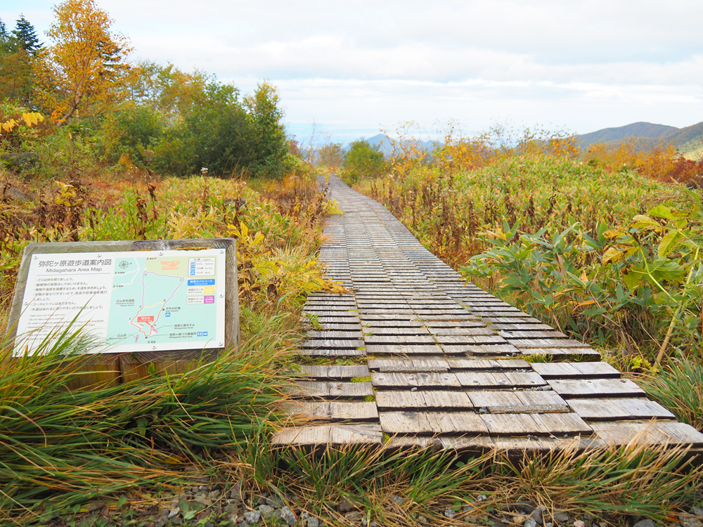 ここからは少し緩やかな上り坂。紅葉に木々に囲まれた木道を歩いていきます。