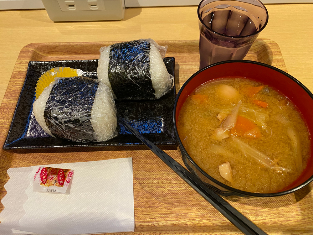 おにぎりにお味噌汁とシンプルなのですが、量が半端ない!