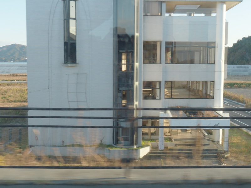 南三陸町の震災遺構ブライダルパレス高野会館を車窓に望みます。この辺りも津波の被害が大きかったエリアで、被害の大きかったエリアは専用線ではなく一般道を通ります。