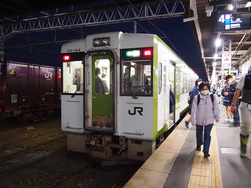 PM5:07 小牛田駅から陸羽東線へ乗換ます。陸羽東線は比較的空いている車両でゆったり乗車でき古川駅に到着です。