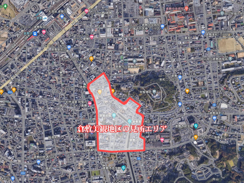 美観地区は倉敷川を挟んで白壁の建物が並ぶ様子が有名ですが、街並みの見所はわりと広範囲に広がります。