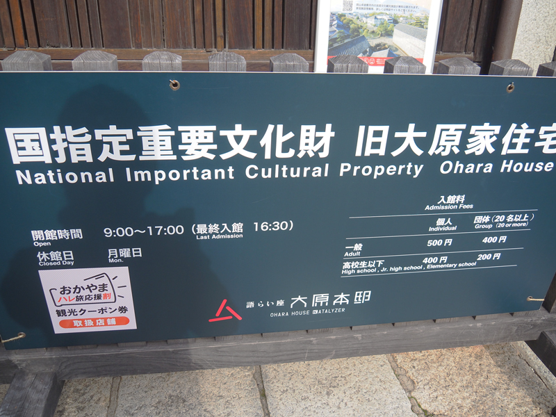 建物は大原家の当主が三代金基の時代の1795年に建築され、以後増築を重ね明治中期に現在の形となったそうです。倉敷の伝統的町家「旧大原家住宅」として主屋、離れ座敷、倉8棟が国の重要文財に指定されています。
