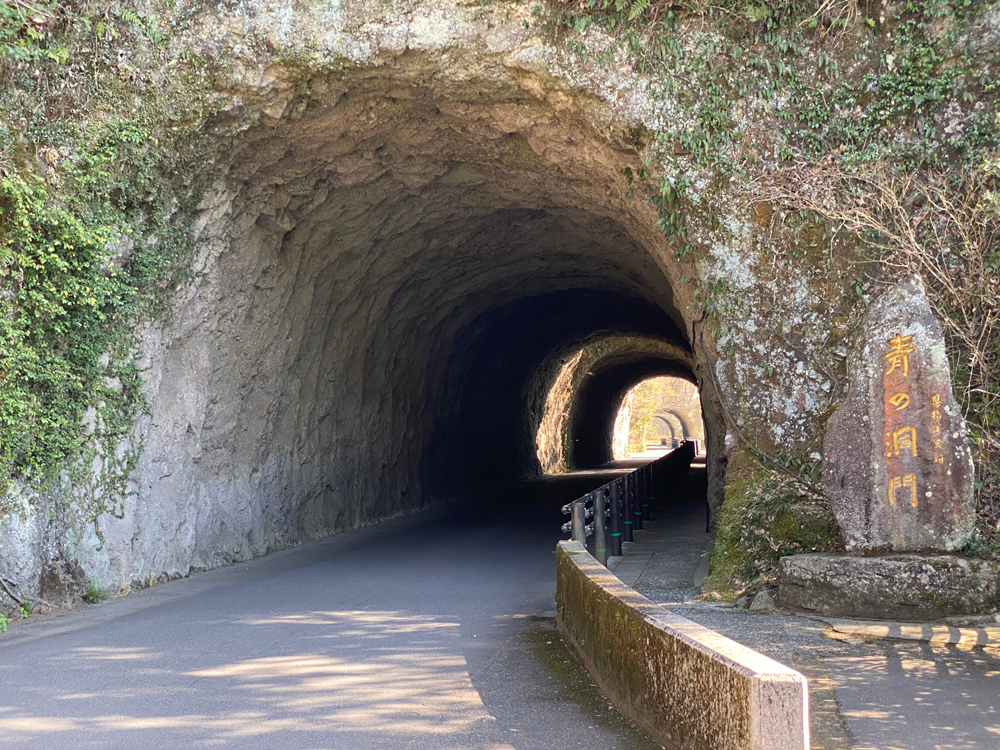 かつての火山活動による凝灰岩や熔岩などからなる台地の侵食によってできた奇岩が連なる光景に圧巻です。また、風食作用や河川の洗掘作用によってできた洞窟も多くあることでも有名で、先ほど通ってきた手掘りのトンネルも青の洞門として有名です。