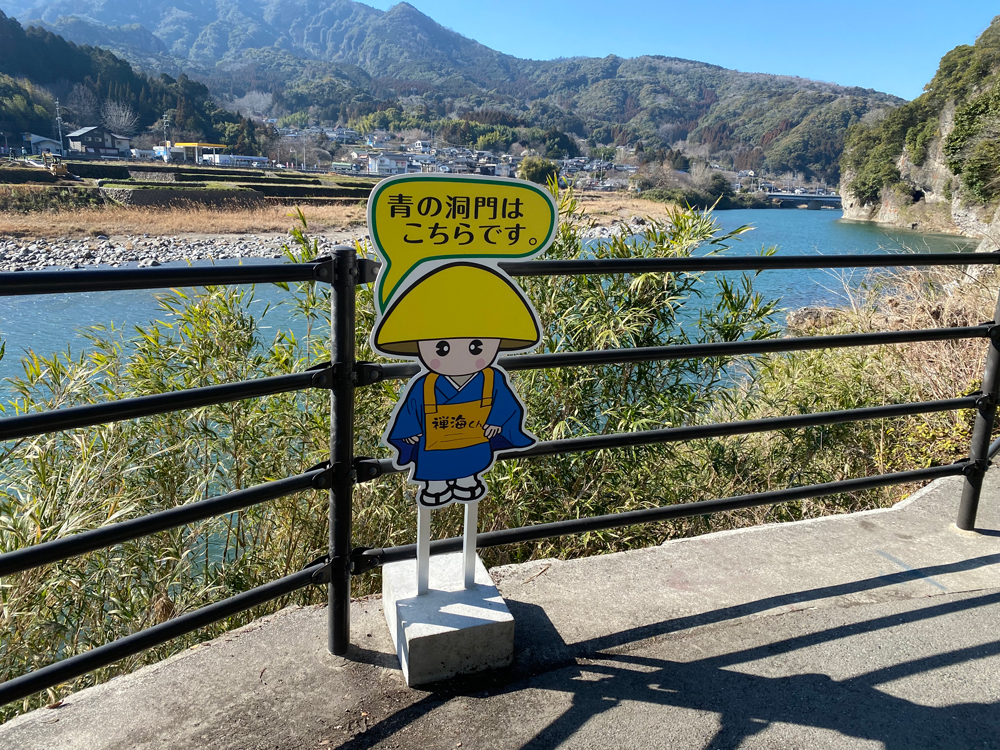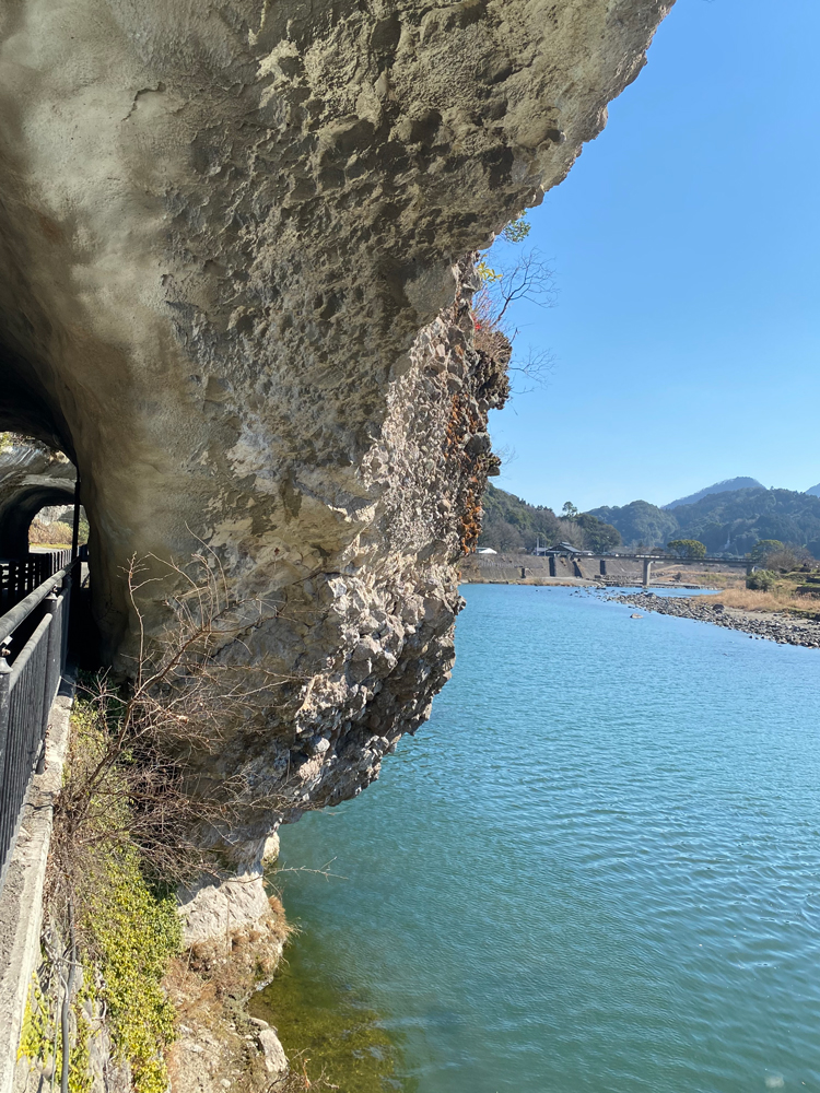 再び、道路の歩道を進んで行くとトンネルが現れ、途中川側に削れてるような部分があります。この部分は通称「青野渡」と言われ、「青の洞門」ができる前はその部分を人畜が通行したと言われています。鎖が張られそれを伝って通行していたと言われていますが何とも恐ろしいですね。
