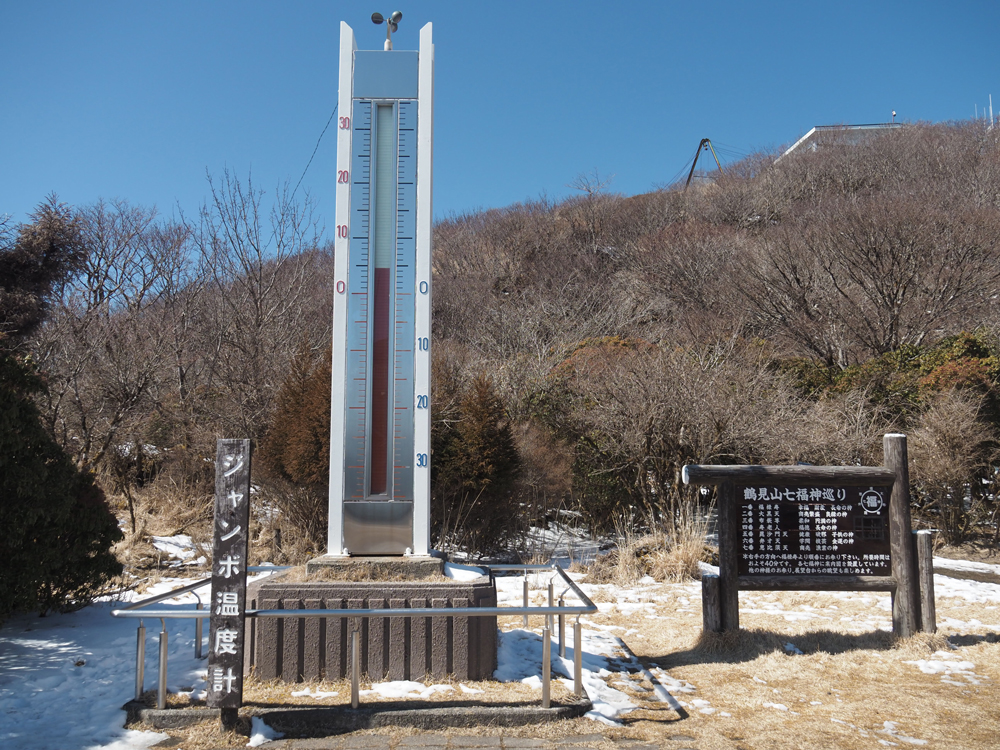 駅を出ると大きな温度計があります。なんと4.5度です。山麓の気温より5度低い感じで、周りには雪が残ります。