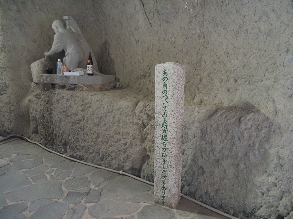 奥に進んでいくと御地蔵様が鎮座し、そのすぐ横の明り窓は禅海和尚が掘削を始めて、最初に掘った明かり窓と言われており一部にノミで削った痕跡も残っています。
