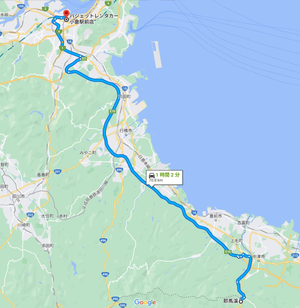 約70㎞少々の距離です、バスの時間まで2時間以上あるので十分だと思いますが都心部に入ると渋滞などもあるかもしれません。もし早く到着して余裕があれば小倉駅で食事を済ませると致します。