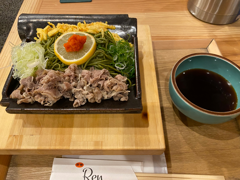 山口県の名物ソウルフード瓦そばをチョイス!この様な瓦で茶そばを乗せて焼いて食べるスタイルです。「錦糸卵、海苔、牛肉、青ネギ」がトッピンもみじおろしが添えられます。美味そうです!