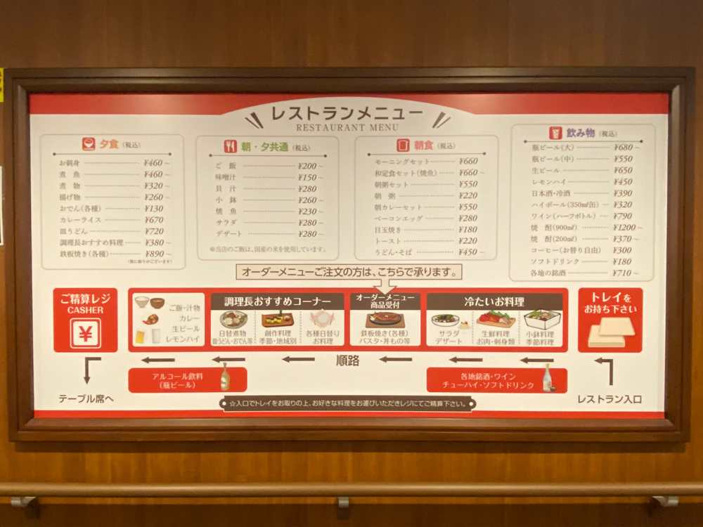 レストランはバイキング形式ではなく単体メニューで選べるので、小食の方やちょっとしたおつまみを食べたい方は良いかもしれません。夜 18:30~21:00と、朝 06:00~入港前まで(日曜から木曜の便)