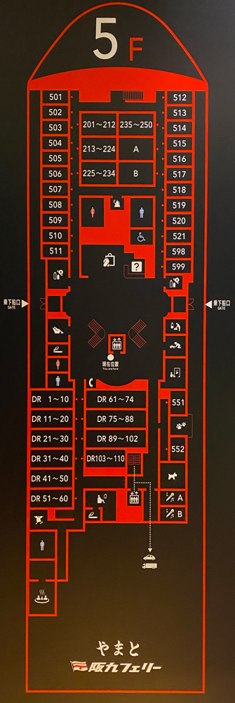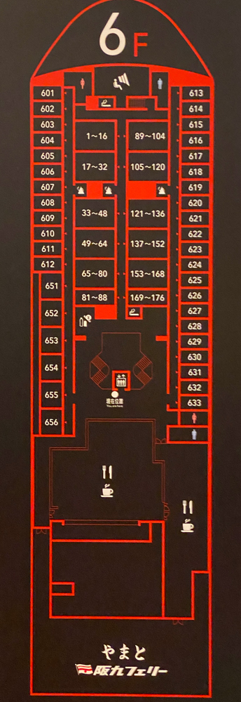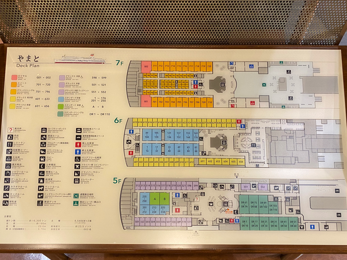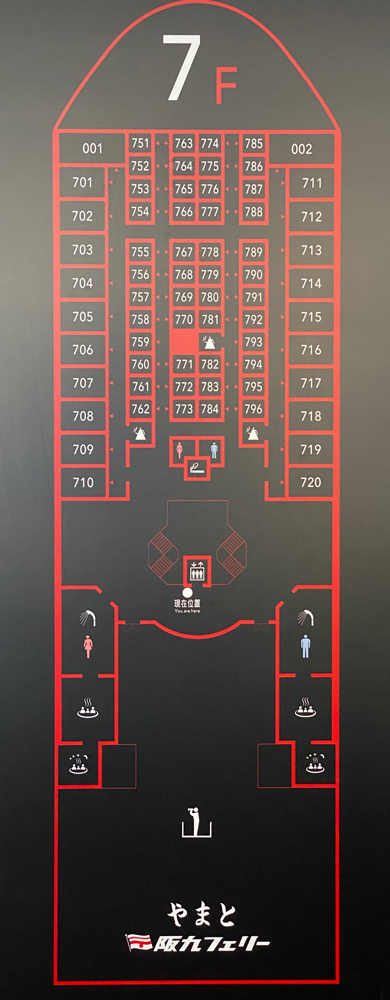 主に船首側に客室があり、中央エントランス付近を中心に、7F展望ロビー大浴場、6Fレストラン、5Fに売店、ゲームコーナーなどがあるようですね。