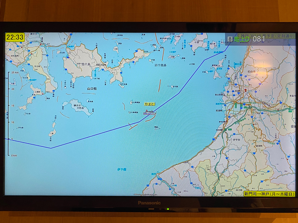 PM10:30を超えました。さていい感じにほろ酔いになり現在地をテレビで確認すると、山口県を超えこれから来島大橋付近(しまなみ海道)を通過いたします。