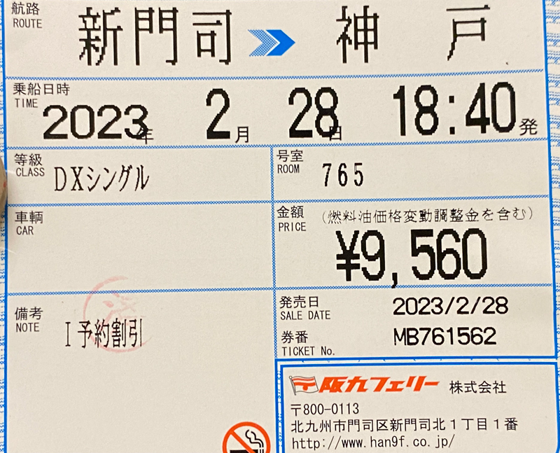 今回9,560円と言うお値段で利用できました。これまで何度か利用したさんふらわあの同等クラスの客室よりもリーズナブルな料金です。これは、先ほど書いた北九州-関西間の貨物輸送需要が高いため各社の競合がある為だと思われます。
