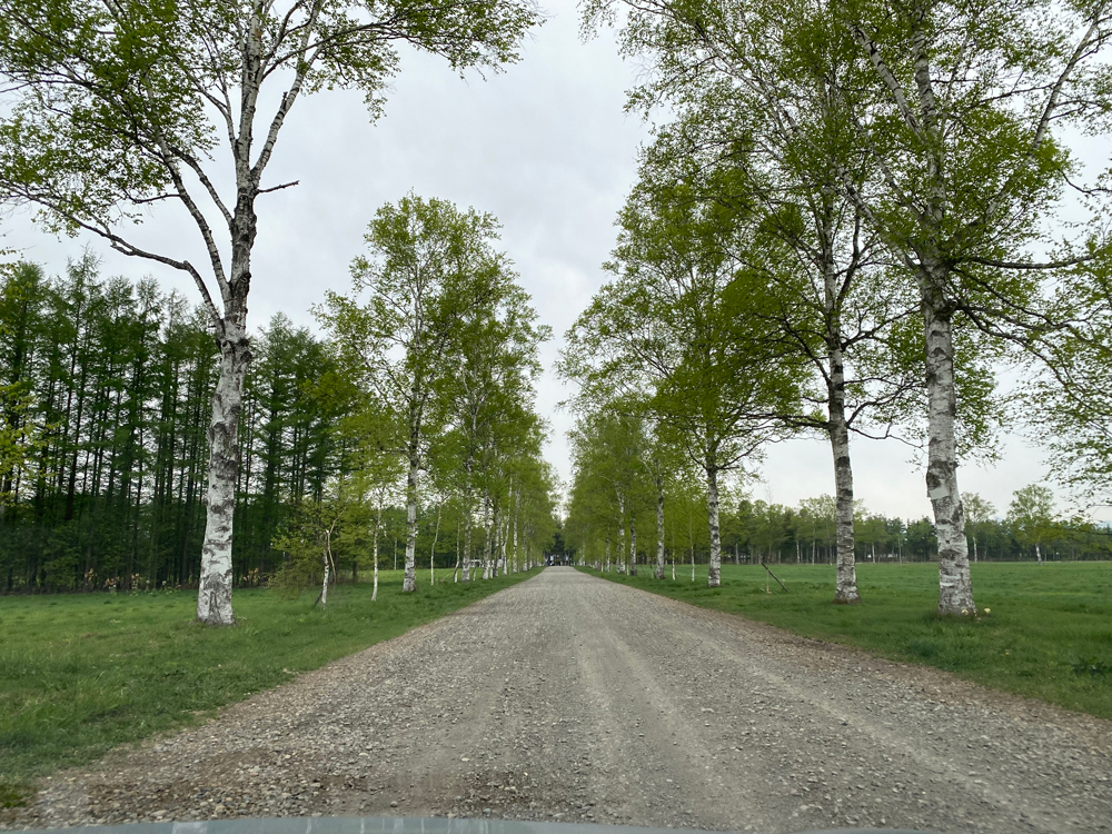 真鍋庭園より約一時間近くかかって十勝牧場の白樺並木に到着しました。真っすぐなダート道に白樺がずらっと並ぶ姿が素晴らしい。