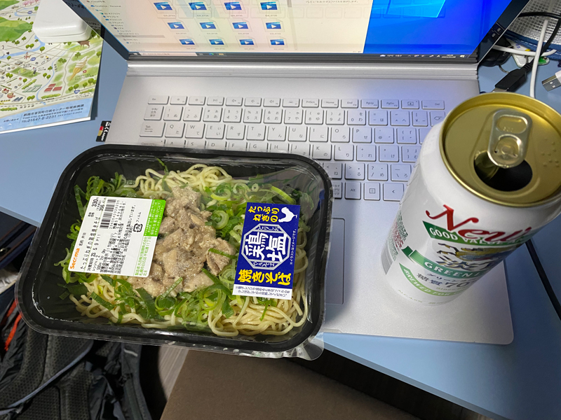 さて、宿から歩いて10分ほどのところにコンビニがあるので、散歩がてら歩いて夕食を購入。