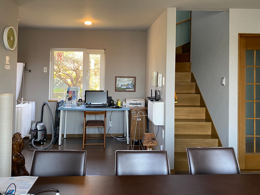玄関を入ると大きなリビングルームがあり、パソコンやホームシアターなどがありました。グループで宿泊したりするには良さそうですね。