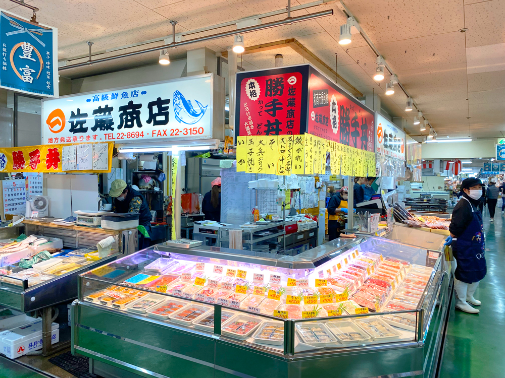 勝手丼と言うのが有名です。皆さん市場内でご飯を購入し好き勝手に具材を選んで、ご飯に乗っけるオリジナル海鮮丼にして頂くらしいです。