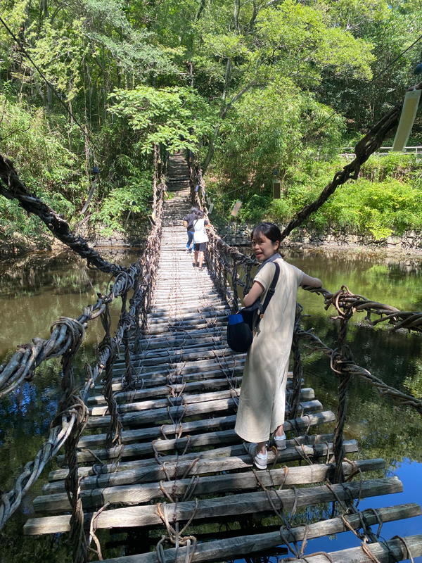 園内は屋島の麓とは言え、90m程度の高低差があり上ったり下りたりとしながら進むことになります。緩やかな坂を上ると、まずは四国村名物のかずら橋へ進みます。