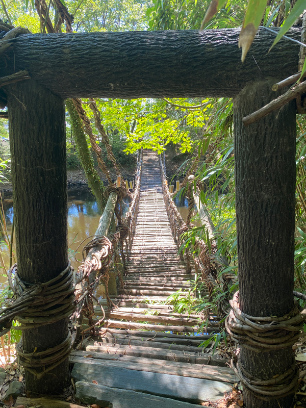 現地にあるかずら橋と同じ造りで作られており、渡るとなかなかスリルが味わえます。とは言え、長さや高さは本物に比べると小さいし低い位置ですので安心です。