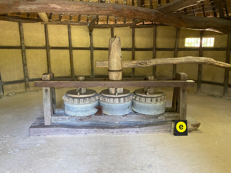 小屋の中央には、「しめぐるま」と呼ばれる歯車の付いた石臼の装置があります。石臼の間にサトウキビを挟み入れて汁を絞り出す仕組みです。そしてこの円形の小屋を牛が回ってしめぐるまを回します。言えば牛がエンジンのようなものですね。