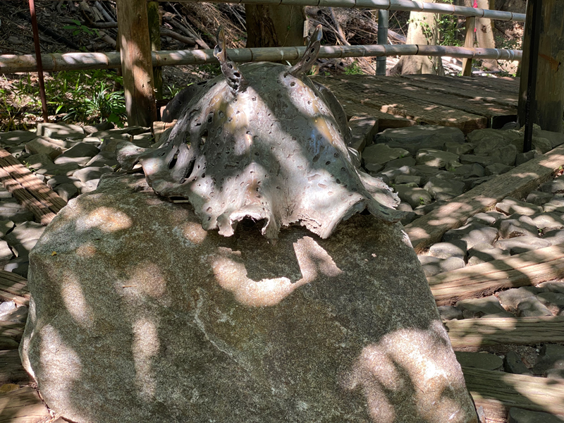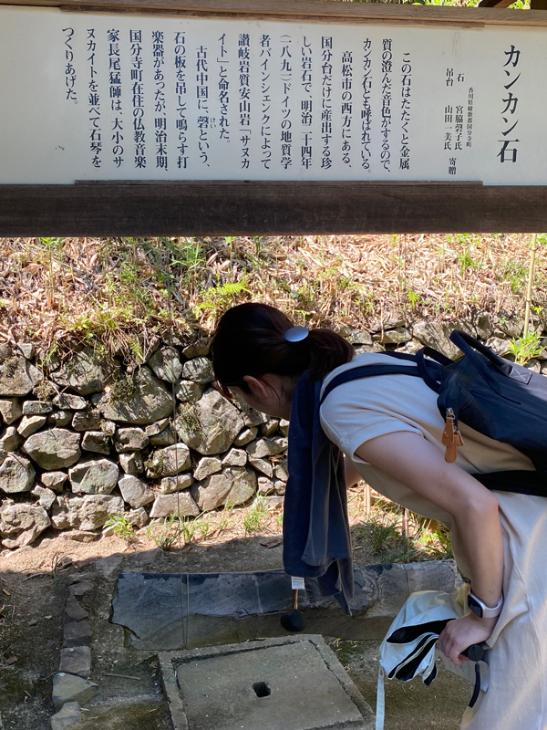 傍らに「カンカン石」と言う綺麗な音色が響く意思があります。これは今朝訪れた香川県立ミュージアムでも勉強したサヌカイト(讃岐岩)とも呼ばれ、屋島をはじめとする香川県北部地域に広く分布する古銅輝石安山岩の一種です。瀬戸内地域で起こった火山活動のマグマが冷え固まってできた岩石です。