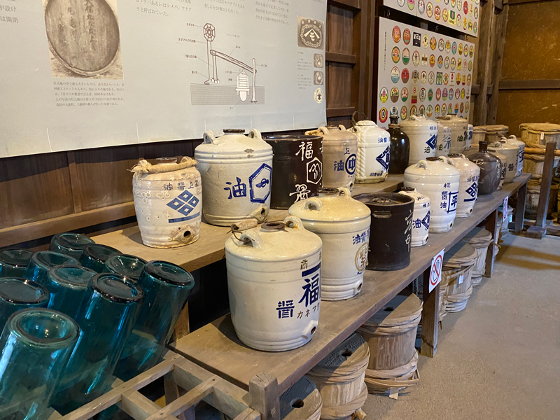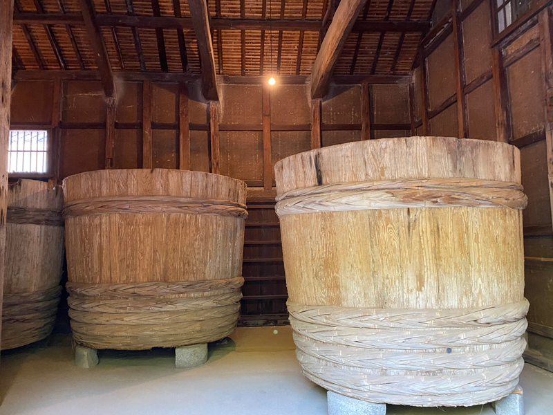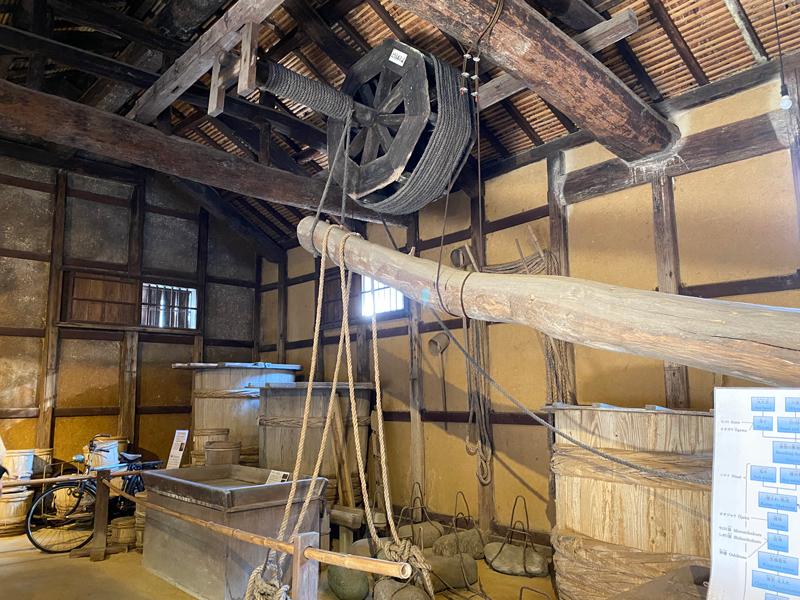 ここには3棟の蔵が移築されており、何れも醤油醸造家で長年にわたり使われてきた施設でした。現在ではすっかり姿を消してしまった仕込桶(しこみおけ)や押槽(おしぶね)など、昔ながらの用具が保管され見ることが出来ました。