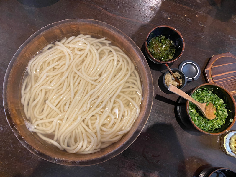 水車と茅葺屋根がわら家さんの特徴で、大きな桶に入って出てくる「釜揚げざいごうどん」が有名です。