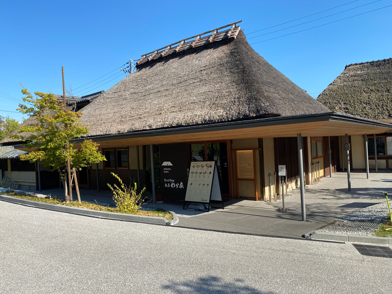 入口から続く「流れ坂」の最終地点付近となる、大きな石が敷き詰められた広場にたどり着きました。この広場から、山側に沿って茅葺き屋根の古民家が並び美しい光景が広がります。