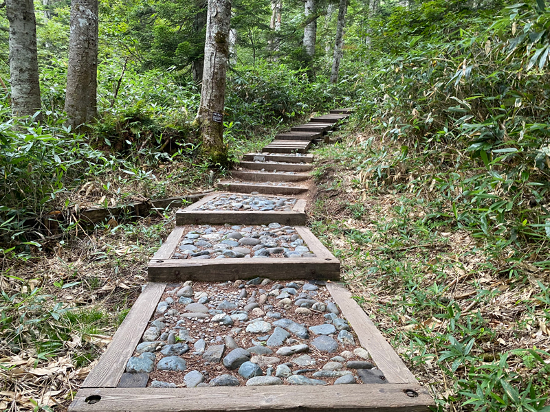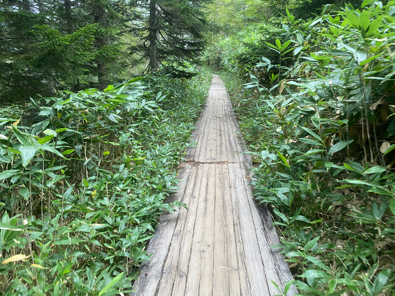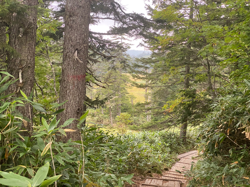さて、再び1㎞弱ほどの下りを歩きます。沼山峠登山口からは、前半約1/3が登りで後は下りと平坦な道のりです。なのでそれほど疲れなく行けそうですね。