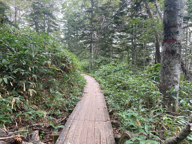 「ダケカンバ(岳樺)」と呼ばれる木々がたくさん生えています。「白樺」の仲間で、白樺が群生する標高よりも高い場所に生える樹木だそうです。これが低山登山とは雰囲気が全く違って新鮮です。
