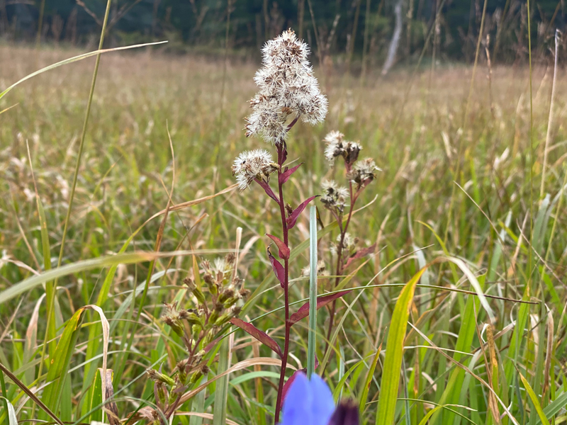時折、紫の綺麗な花が目につき、植物アプリで調べてみると、猛毒のオゼトリカブトです。そのほか綿毛になったミヤマアキノキリンソウなどがたくさん生えていました。