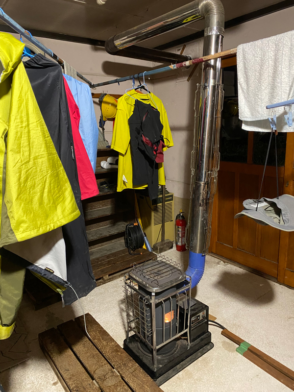 シューズ置き場と乾燥室が一緒になっており、ストーブで乾燥します。
