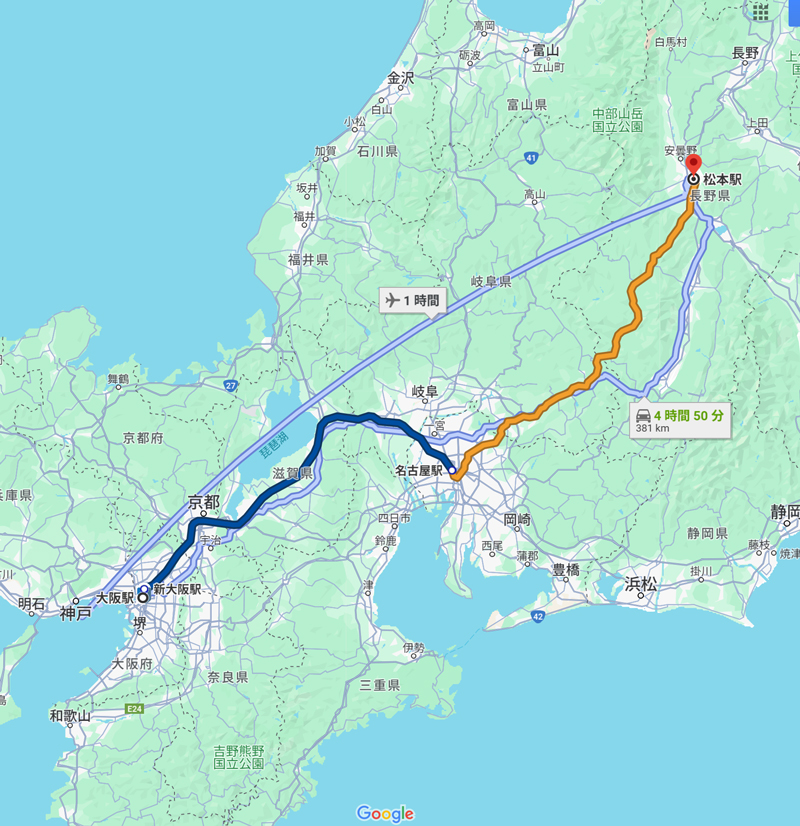 今後松本には何度か行くことになるため、まずは関西~松本までの移動手段(料金&時間)を検証してみたいと思います。