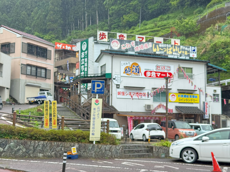 駅前にロータリーがあり、祖谷温泉やかずら橋へのバスの乗り場にもなっています。そしてひときわ目立つのがぼけマートと言う自元のスーパーマーケット。