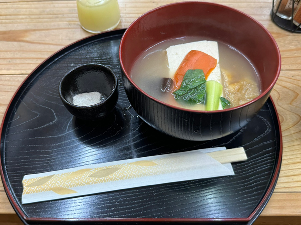 祖谷の地元素材をふんだんに使用した「ぼけ祖谷汁」と「ぼけ揚げ」を頂きます。