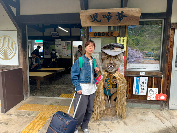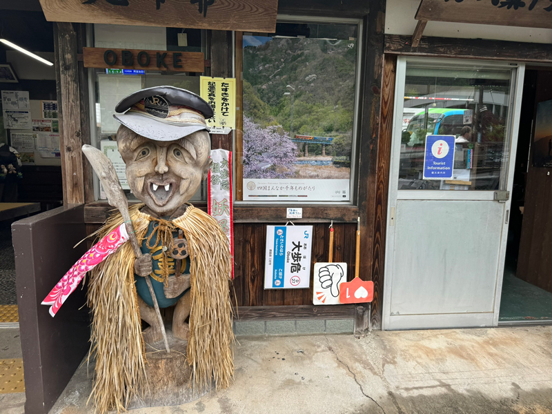 駅にはこなきじじいのオブジェがあります。徳島県三好市は、ゲゲゲの鬼太郎に登場するこなきじじいの発祥の地も言われ、60種類以上の妖怪が伝承されている妖怪郷です。