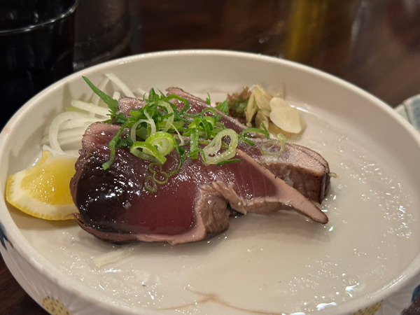 ウツボの天ぷらにはビール🍺 塩だれで頂くカツオのたたきは日本酒🍶