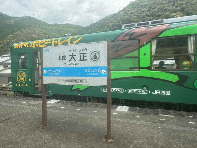 窪川から30分少々、予土線に入ってから比較的大きな集落が見えてくると土佐大正駅に到着です。ここで列車行き違いのためしばらく停車します。