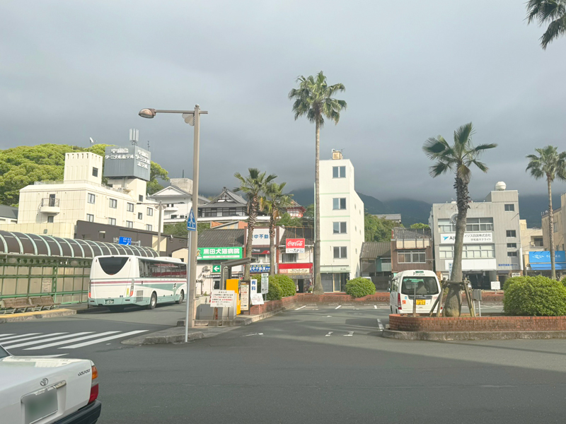 宇和島駅前は、バスロータリーがあり、その仕切にヤシの木がたくさん生え南国的な雰囲気です。