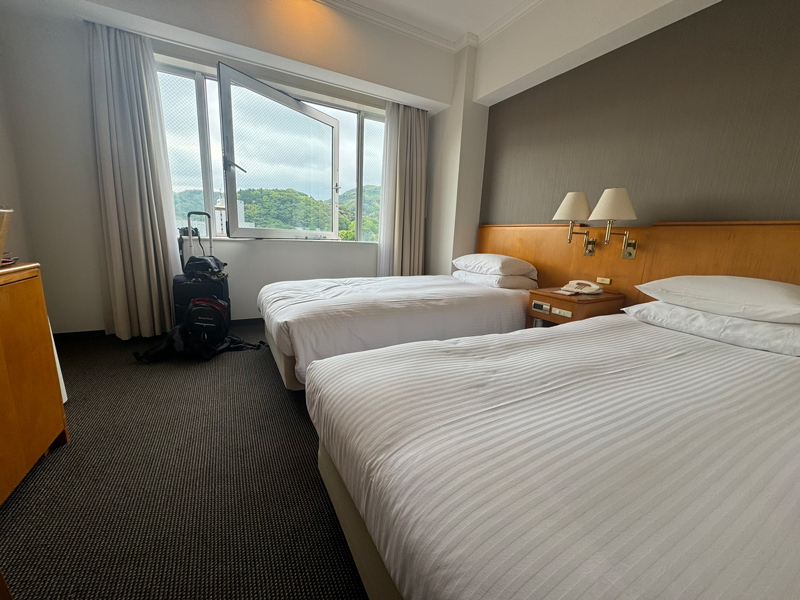 客室はよくあるツインルームですが、今回は駅ホーム側のお部屋に当たりました。窓からは、ホームが見えトレインビューの客室となっています。