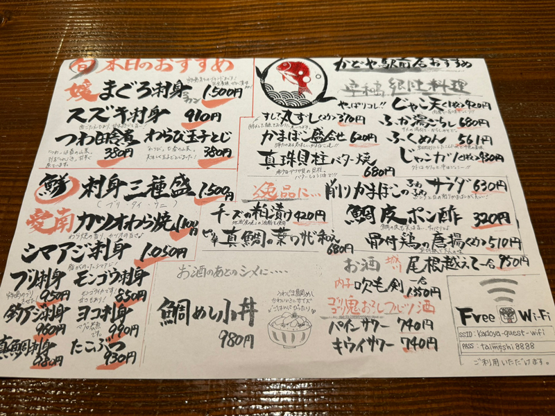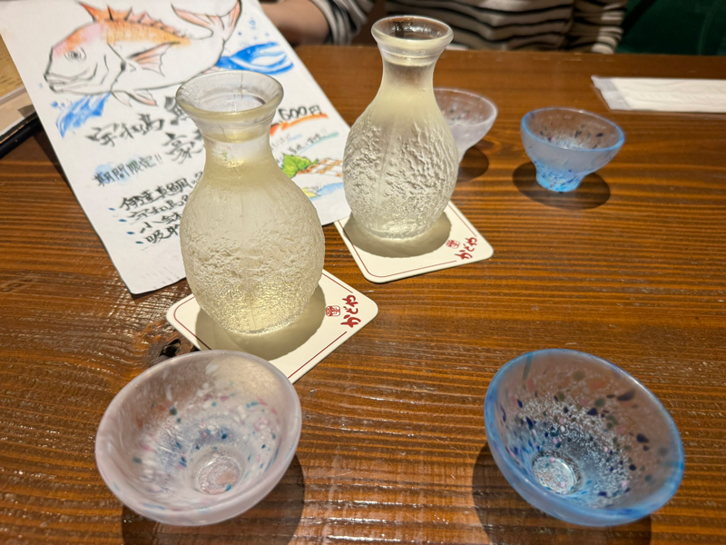 鯛めし以外にもメニューは豊富にあり、まずはお刺身やじゃこ天をあてに日本酒の飲み比べ。