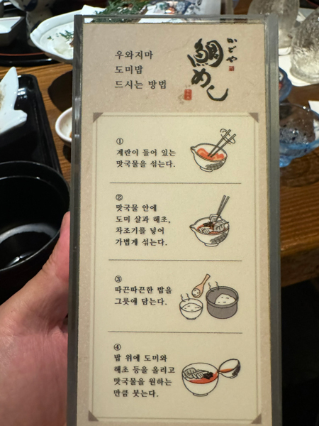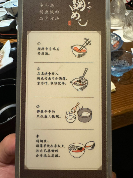 そしてメインの鯛めしです!鯛めし御膳は自分で鯛と出汁を混ぜて作ります。その作り方の説明書きがあったのですが、せっかちな私は読まずにオリジナルで作ってしまいました。