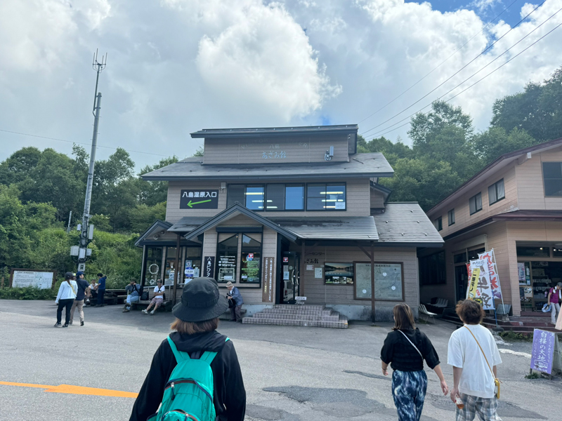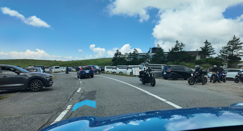 お昼を過ぎると、さすがにお盆休みということもあって、道路は少しずつ混雑が始まりました。渋滞を抜けつつ、15分ほどのドライブで「八島ビジターセンター あざみ館」のある駐車場に到着。しかし、駐車場は満車状態。でも幸運なことに、警備員さんの的確な誘導のおかげで、スムーズに駐車することができました。