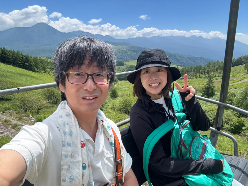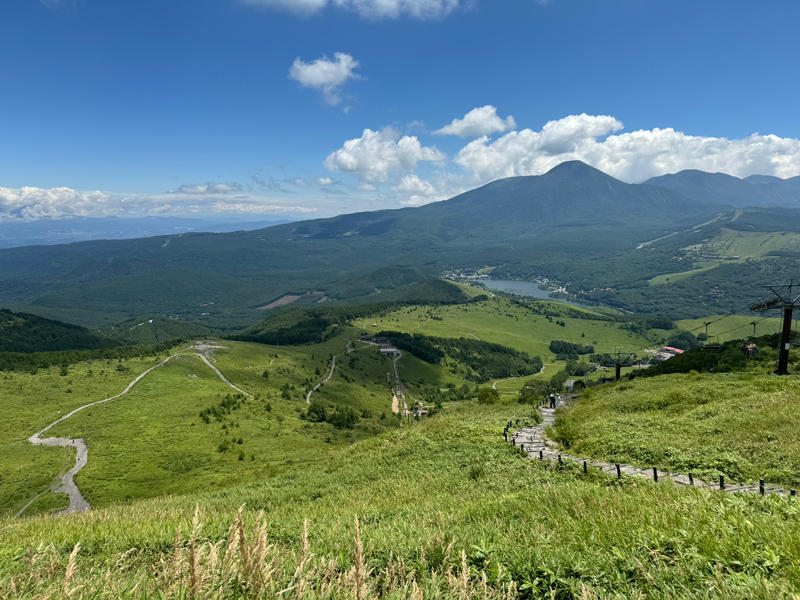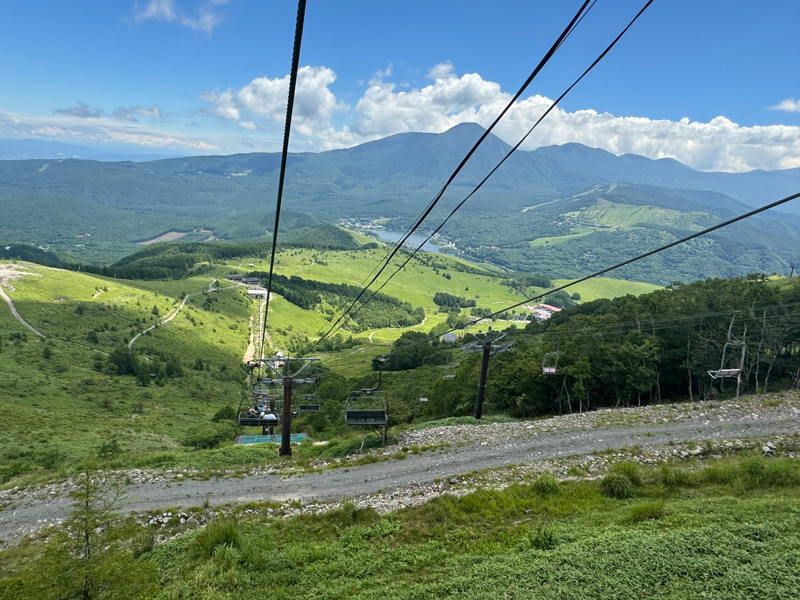 リフトが徐々に高度を上げると、眼下には美しいパノラマが広がります。天気も良く、日差しは強いですが風が涼しく、まさに爽快!山頂からの眺めは圧巻で、先ほど訪れた白樺湖が遠くに小さく見えます。