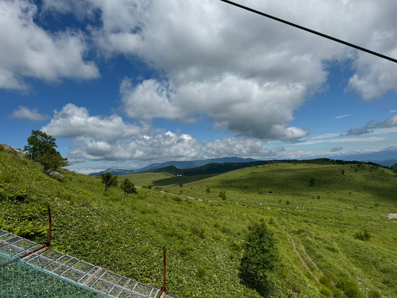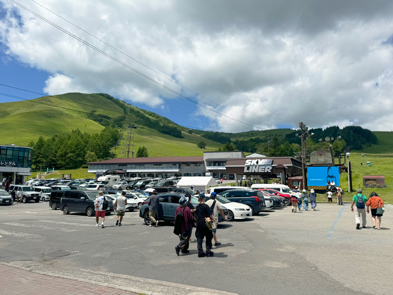 辿り着いたのは、車山高原の山麓に広がる大きな駐車場。周囲を見渡すと、四季折々の表情を見せるこの場所は、冬にはスキーリゾートとして賑わうことで知られています。今は緑に覆われたゲレンデが、冬の訪れとともに雪に染まり、スキーヤーたちを迎える準備をするのでしょう。高原の涼やかな風が吹き抜け、広々とした空間がどこまでも続いています。