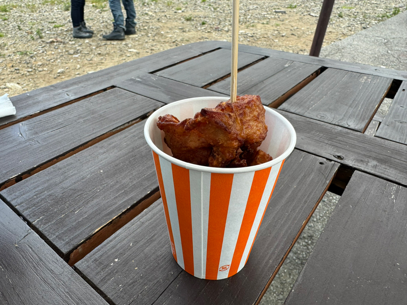 正午、PM12:00に霧ヶ峰自然保護センターに到着。しかし、ここは大混雑!昼時ということもあり、食事処「霧ヶ峰ビーナス」は満席で入れません。そこで、外の売店で「シャインマスカットソフトクリーム」「ホットドック」「から揚げ」をいただき、軽いランチを済ませました。