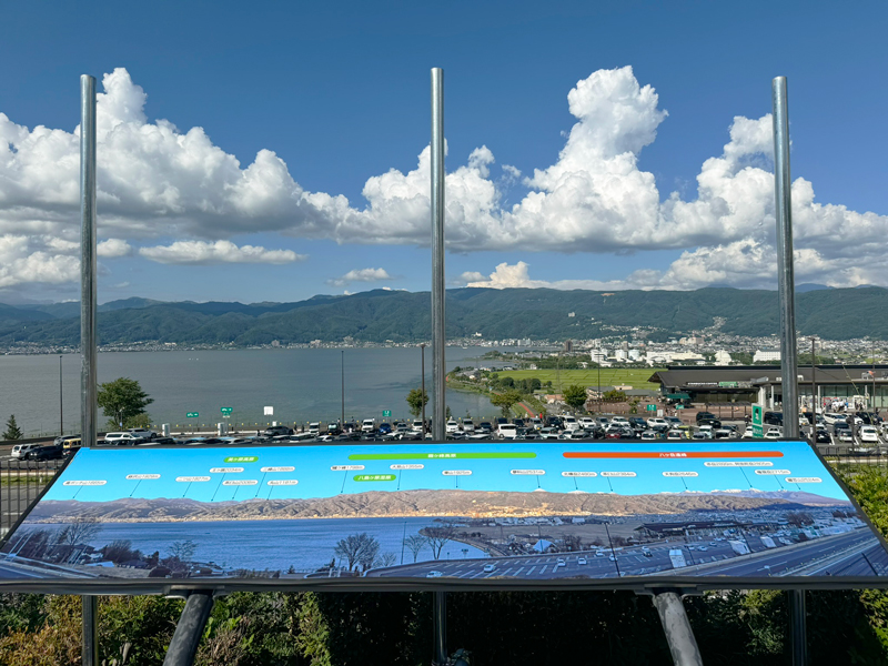 八島湿原を満喫した後は、霧ヶ峰を後にします。次のルートは、県道40号線を南下して上諏訪方面へ。やはりお盆の渋滞がじわじわと発生し始め、想像通りの混雑でしたが、何とか中央道に乗り、午後3時半には諏訪湖SAに到着しました。