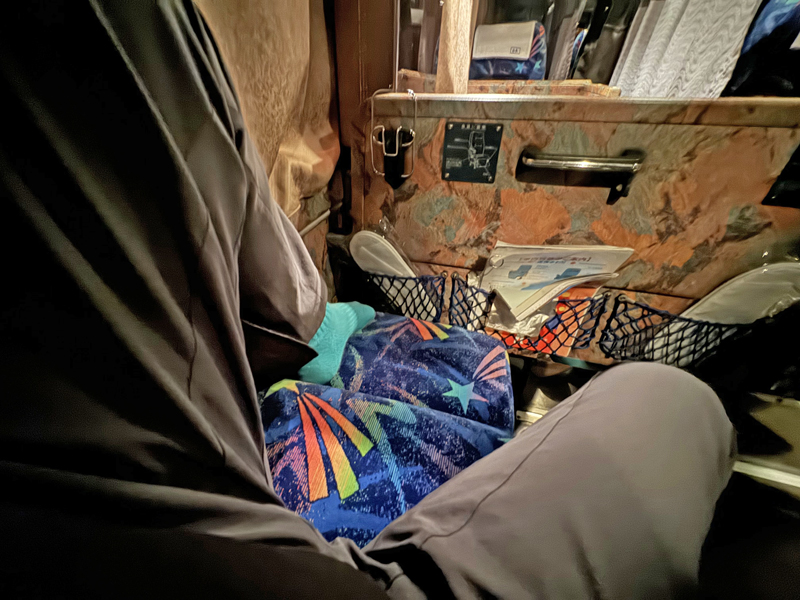 実際にリクライニングして足を伸ばしてみると、前の階段壁が近いせいか少し狭さを感じますが、壁の上に足を置くことで快適な姿勢が取れました。使い捨てスリッパも用意されており、長距離移動にはありがたい配慮です。