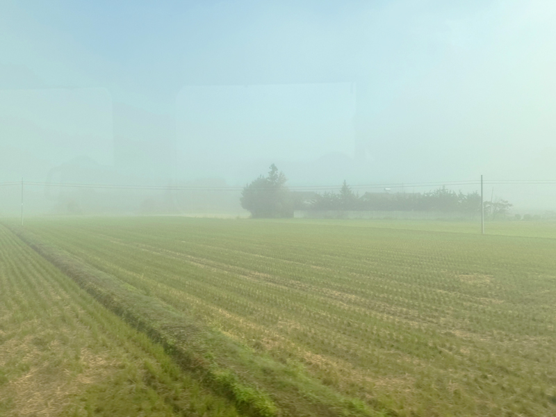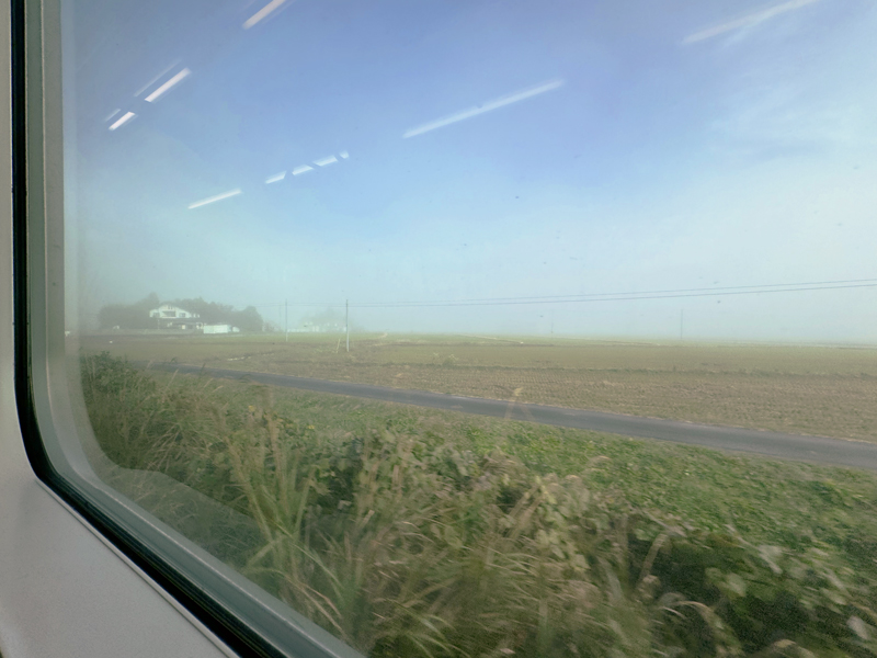 4両編成の車両には空席が目立ち、ボックスシートを一人で独占できる贅沢な空間。ここから、霧に包まれた幻想的な田園風景を眺めながら進んでいきます。