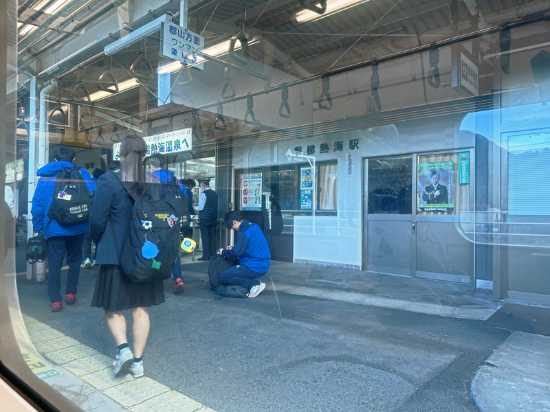 会津若松までの道中、列車は15分ほどで会津熱海駅に到着。ここでは通学の高校生たちが次々と降りていき、車内はさらにゆったりとした雰囲気に。